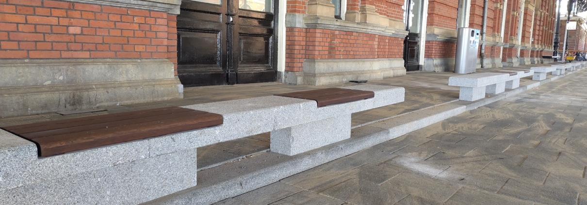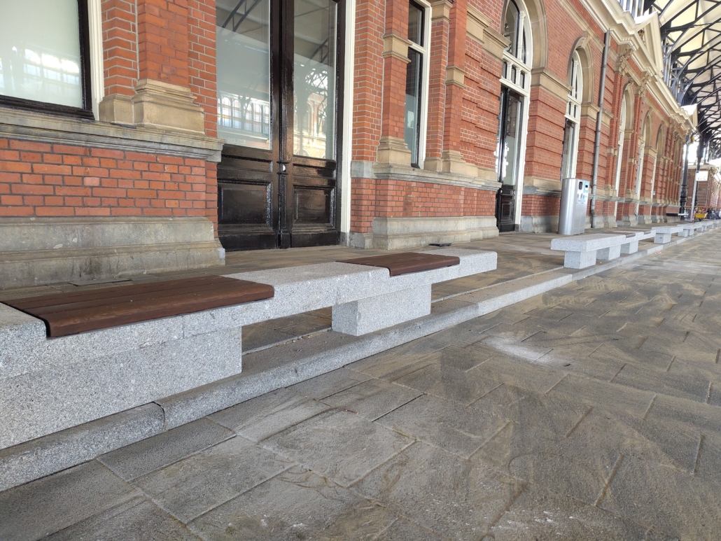 Het middenperron van den Haag HS voldeed niet meer aan de eisen en richtlijnen om reizigers veilig en onbelemmerd gebruik te laten maken van de trein. Het perron diende met minder afschot aangelegd te worden. Ter plaatse van perrongebouw A en C is, vanwege het aanmerkelijk grotere hoogteverschil, gekozen voor een split-levelperron waardoor de bestrating direct aansluit op de perronrand en op de gevels van de monumentale perrongebouwen. Tussen het hoge en lage deel van het perron zorgen natuurstenen zitelementen voor een duidelijke op- en afstap. De houten zittingen sluiten in houtsoort en kleur aan bij de houten banken verderop op het perron.