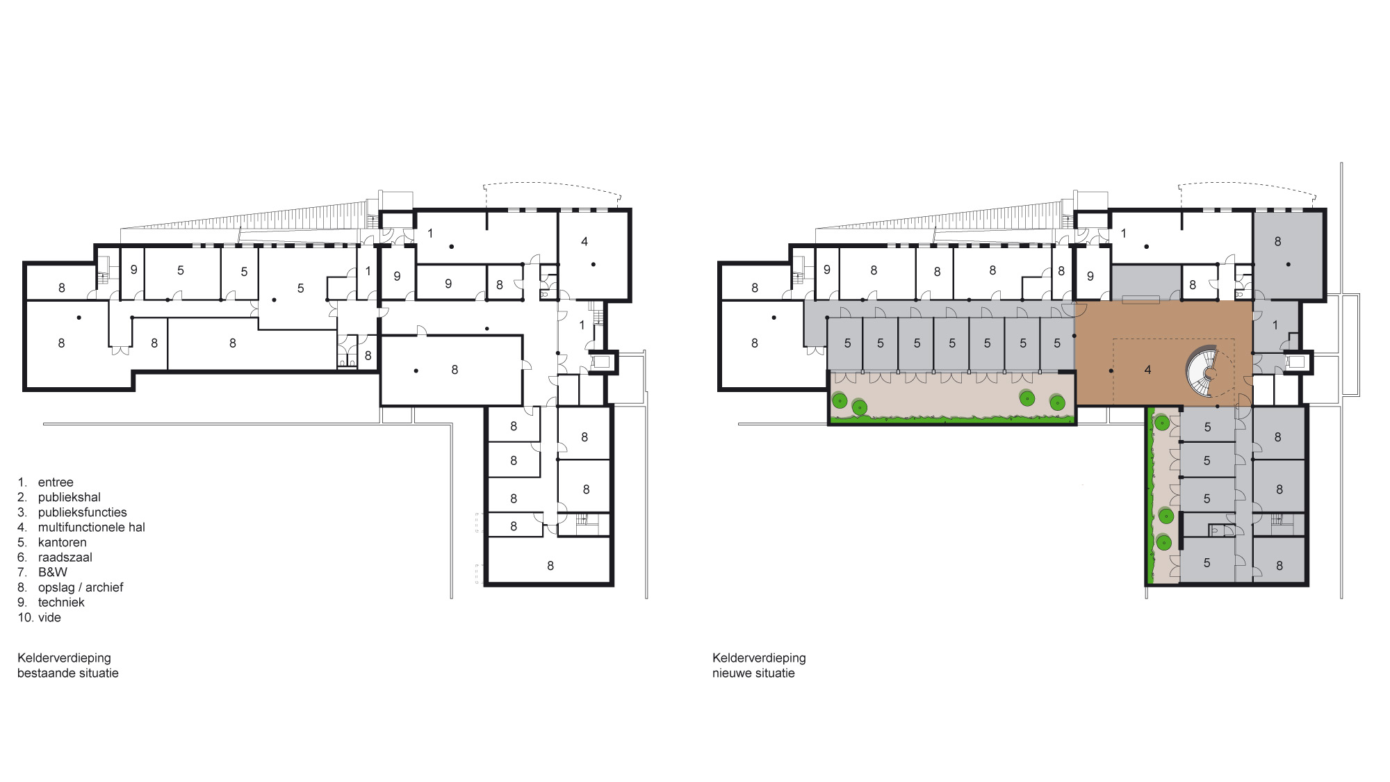 The internal routing in the current building however does not allow for the housing of a new organisation. The current position of the staircases makes it virtually impossible to use the main hall as a meeting place and disrupts an efficient routing in the building. Access to the basement is hidden and therefore functionally and visually closed off from the rest of the building. Additionally, the building appears to turn its back on the town centre’s main road: the Dorpsstraat. Finally, the council chamber, the ‘heart’ of the administration, has the outward appearance of a closed bastion.